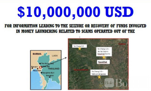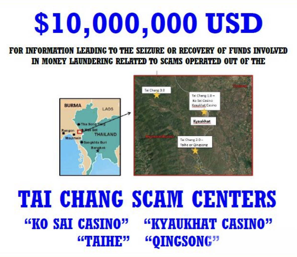 据消息,美国方面今日宣布,将对提供妙瓦底地区泰昌园区相关线索、并有助于捣毁该园区网络的人员提供1000万美元奖励。