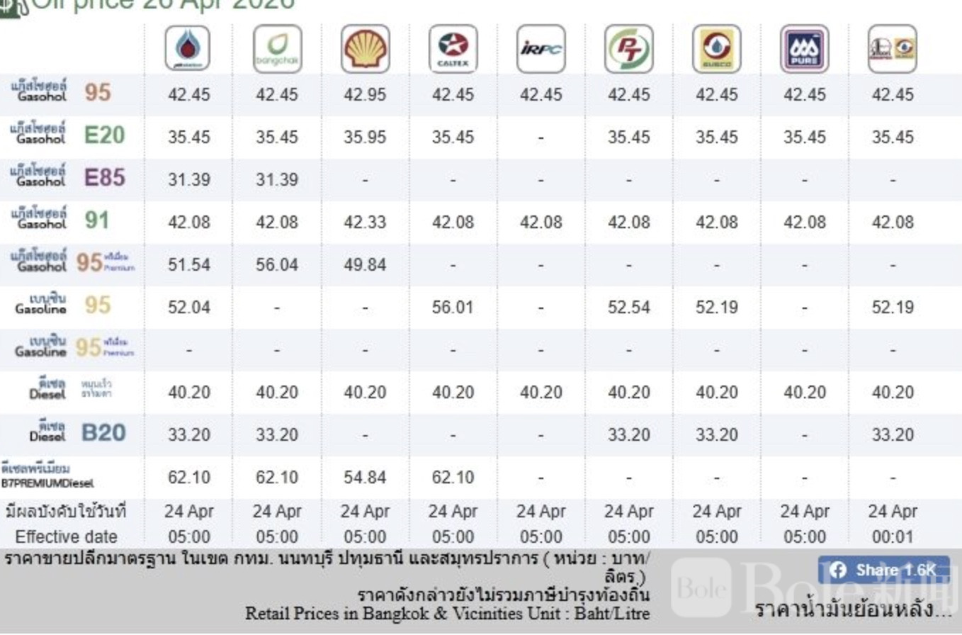 Bole新闻专讯:泰国能源政策与规划办公室(EPPO)公布2026年4月26日最新全国主要加油站油价数据,涵盖PTT、Bangchak、PT、Caltex及Shell五大品牌,涉及汽油、柴油及多种混合燃油价格。