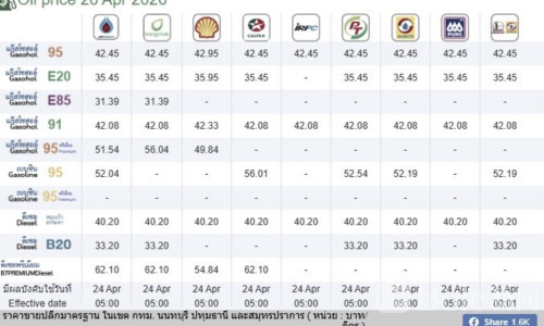PT加油站方面,Gasohol 95为42.45泰铢/升,E20为35.45泰铢/升,Gasohol 91为42.08泰铢/升,普通汽油95为52.54泰铢/升,柴油与B20保持40.20及33.20泰铢/升。