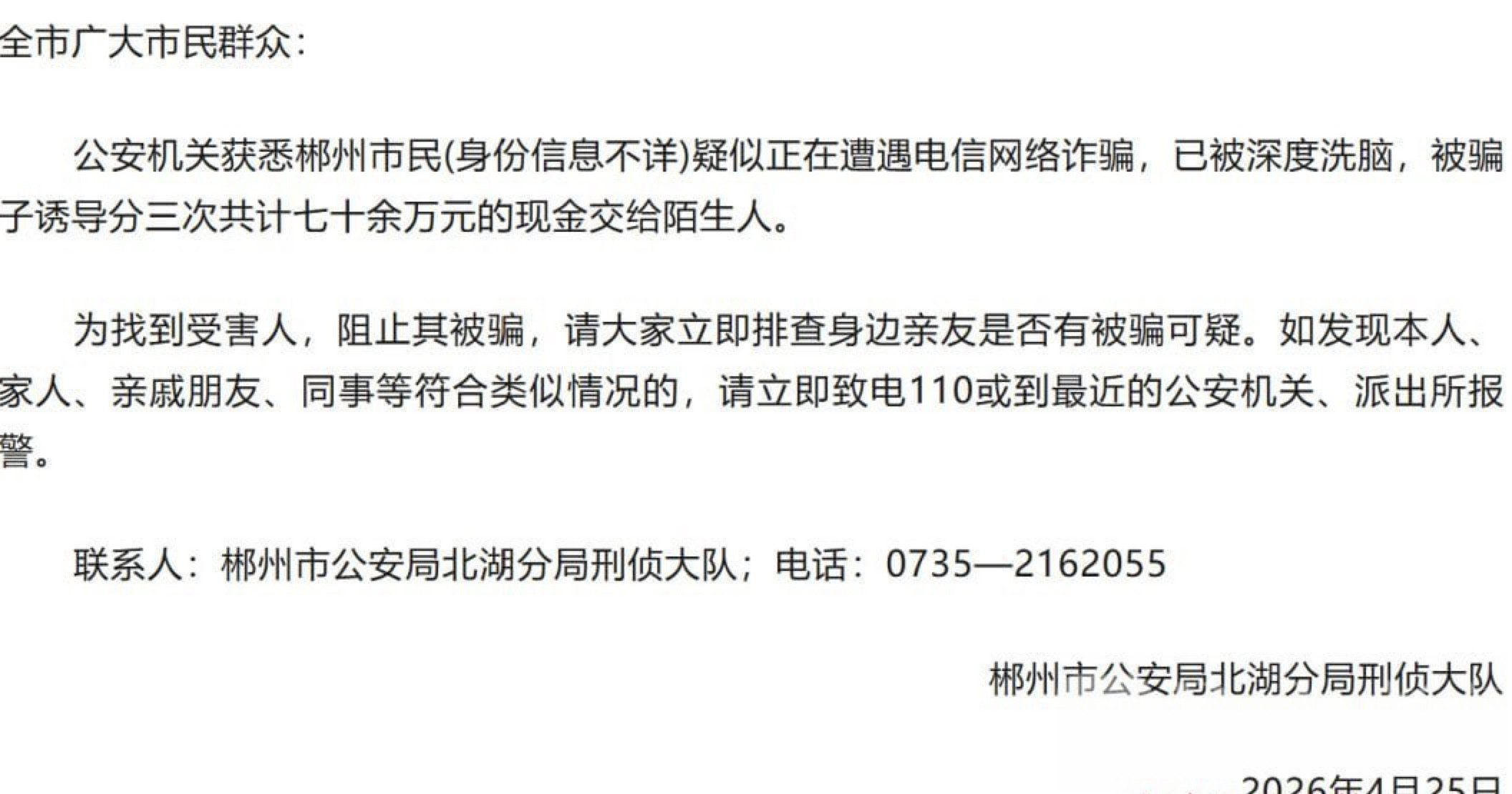 Bole新闻专讯:2026年4月25日,中国湖南省郴州市北湖警方发布紧急通报,称一名市民疑似遭遇电信诈骗,在被诈骗分子深度“洗脑”后,已按照对方指令分三次向陌生人交付现金,总金额高达70余万元,目前警方正全城紧急寻找该女子下落。