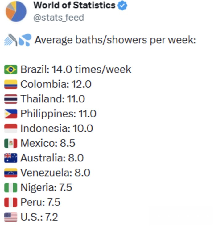 Bole新闻专讯:近日,统计账号“World of Statistics”发布了一项关于全球各国人均每周洗澡次数的统计数据,引发关注。数据显示,不同国家因气候与生活习惯差异,在洗澡频率上存在明显区别,其中热带与亚热带国家普遍洗澡次数较高。