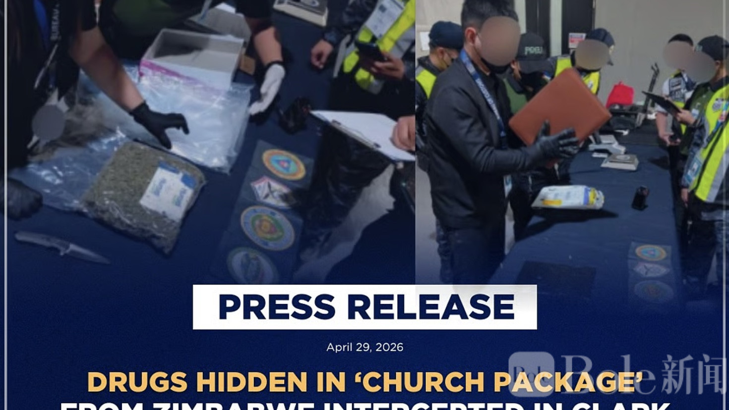 Bole新闻专讯:菲律宾执法部门近日在邦板牙省克拉克自由港区展开一次毒品拦截行动,从两个国际包裹中查获总价值约560万比索的非法毒品,而其中一个包裹竟伪装成寄往教会的文件包裹,试图蒙混过关。