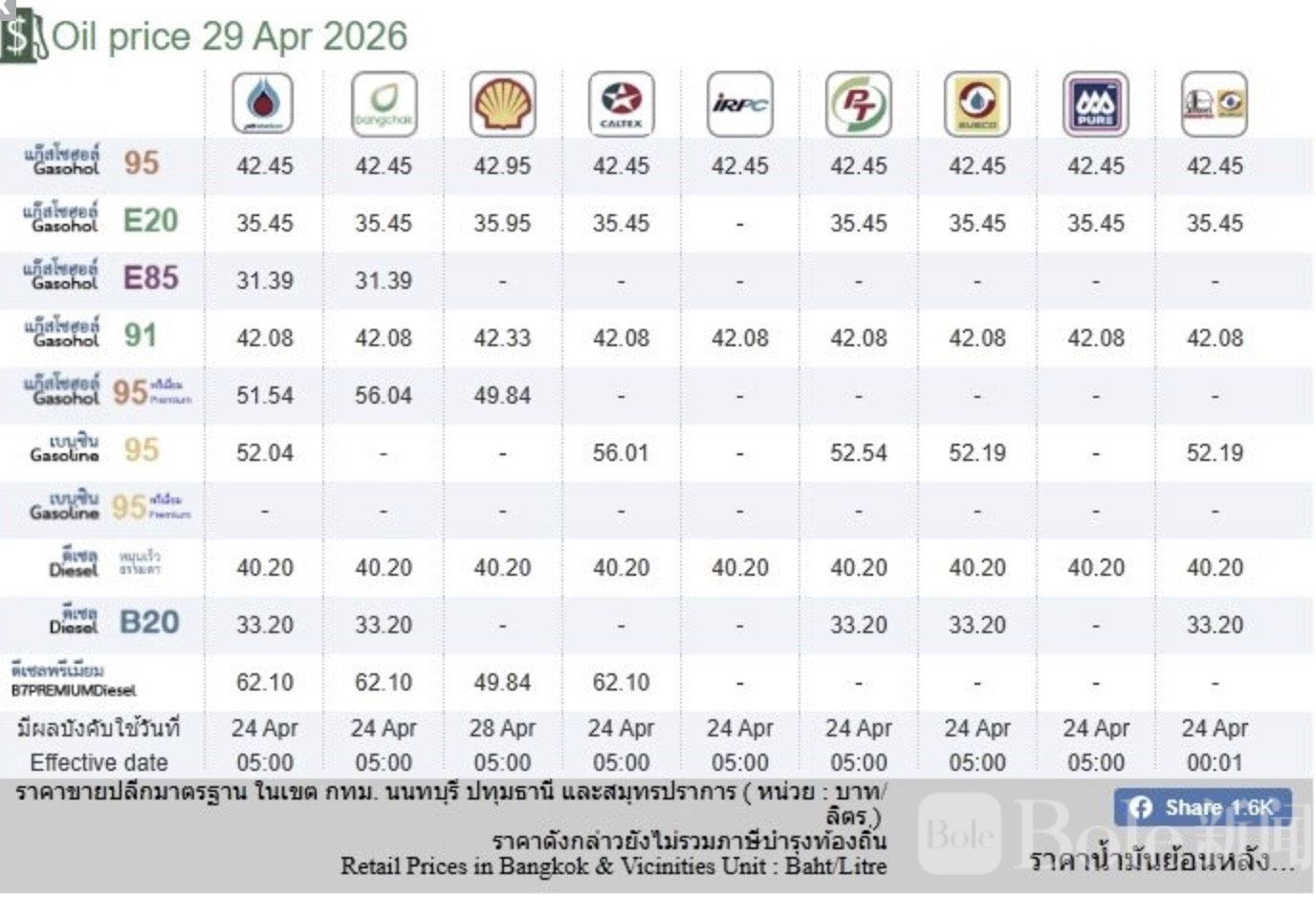 Bole新闻专讯:泰国能源部下属政策与规划办公室公布2026年4月29日最新油价数据,涵盖5大主流加油站,包括PTTBangchakPTG EnergyCaltexShell。整体来看,各品牌油价差异不小,部分高端油品价格差距明显。